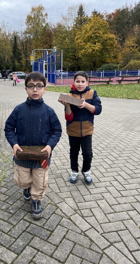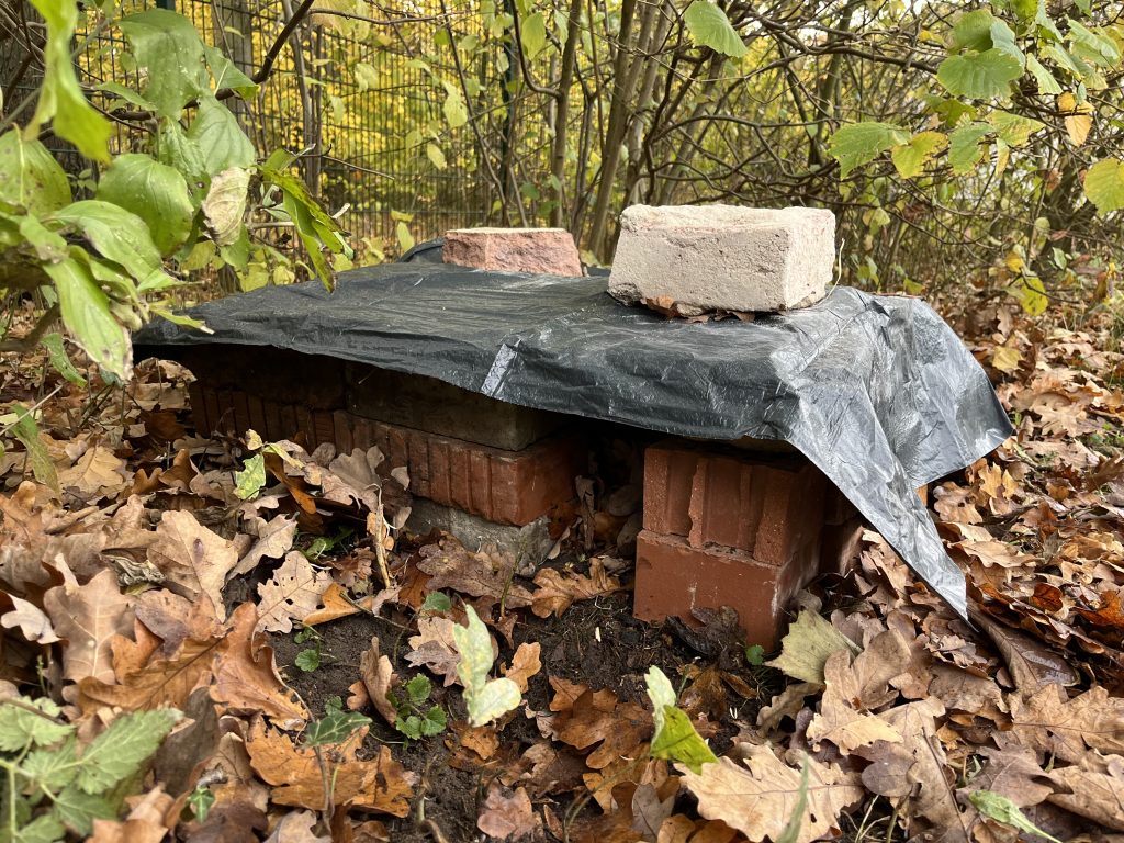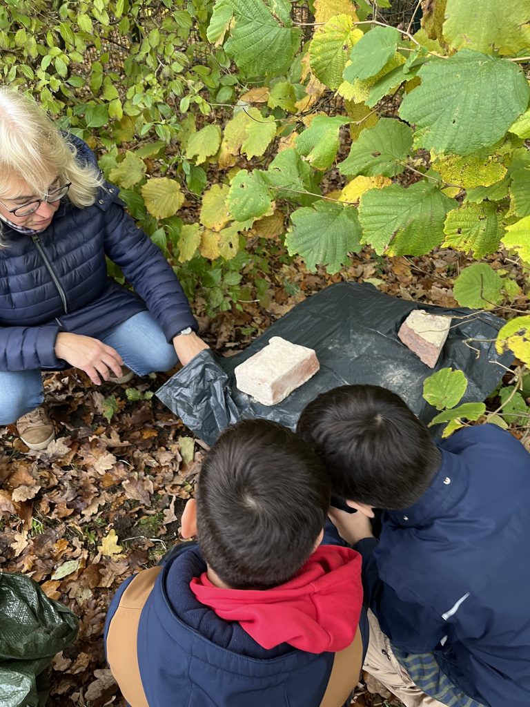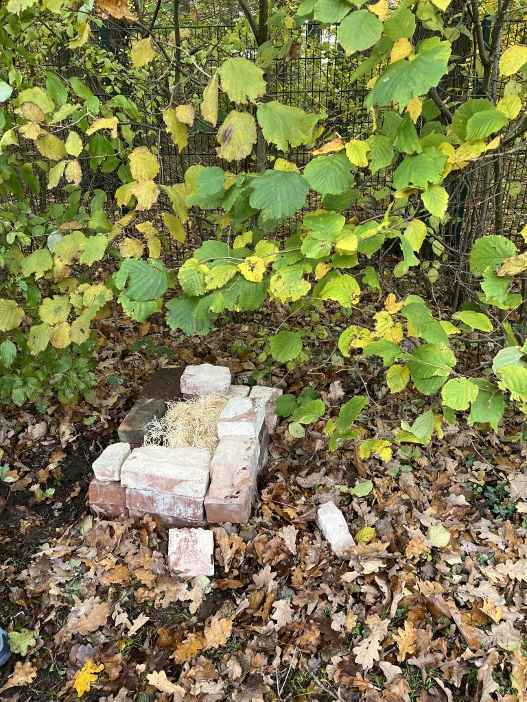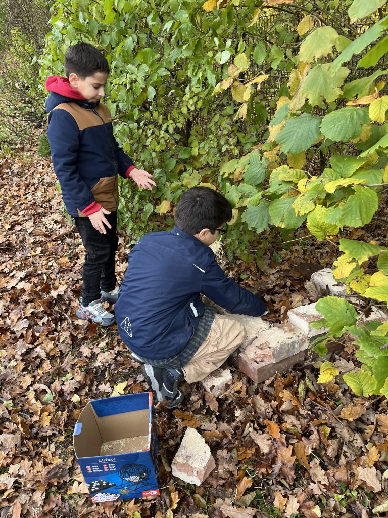 Die Zweitklässler haben im Sachunterricht ein Igelhaus gebaut. Dafür mussten sie viele Steine tragen. Innen füllten sie das Steinhaus mit Blättern. Außen schützten sie es mit einer Holzplatte, einer regensicheren Plastikabdeckung und vielen Blättern und Zweigen. Nun hoffen alle, dass ein Igel dort Unterschlupf findet und in Ruhe im Garten der Primarstufe seinen Winterschlaf halten kann.